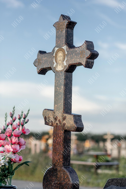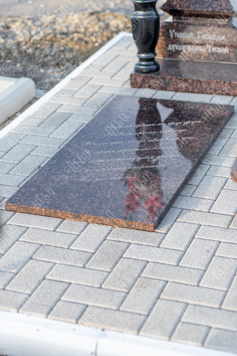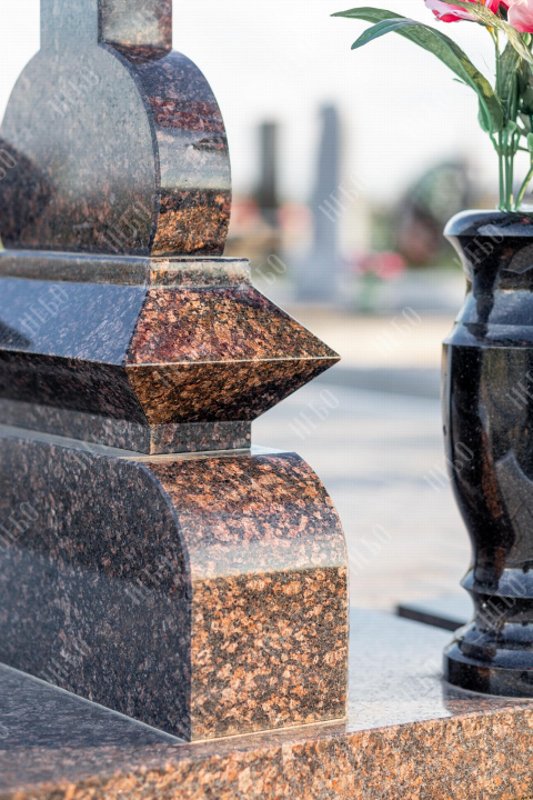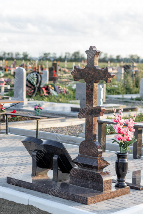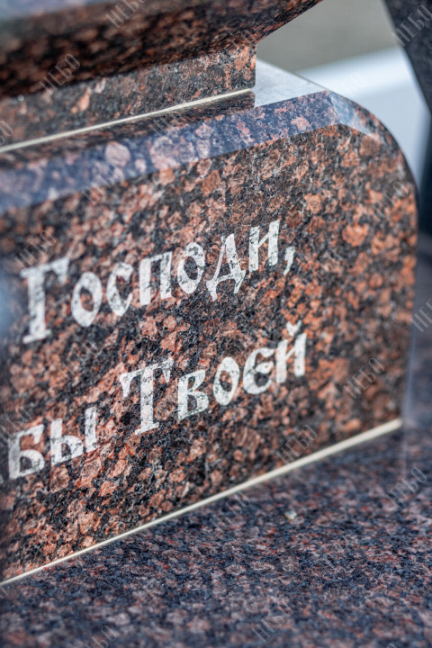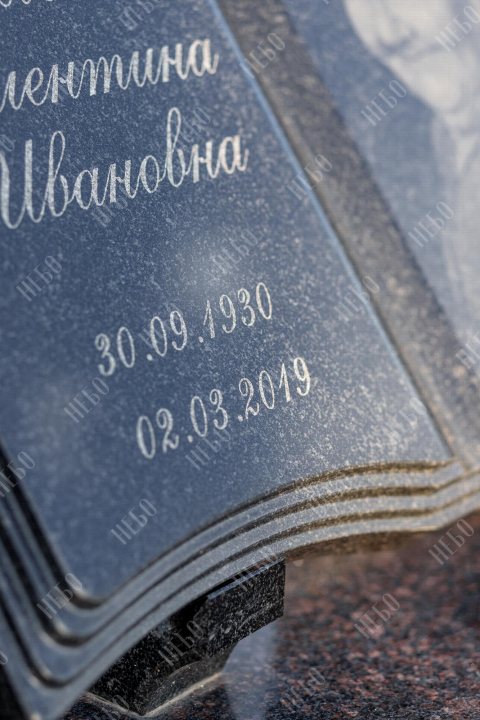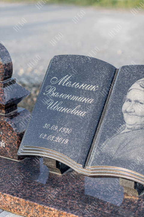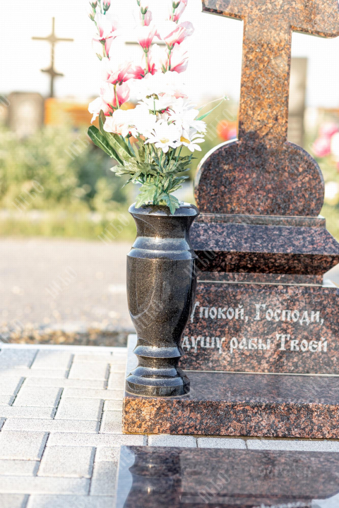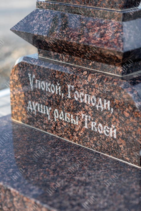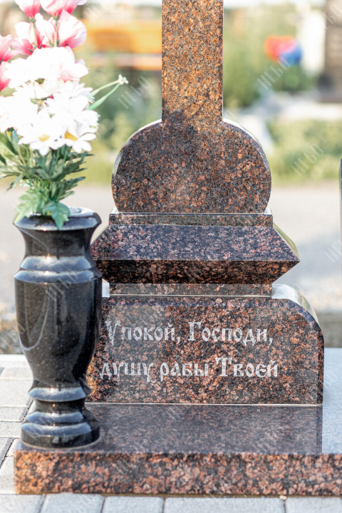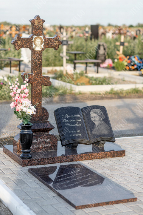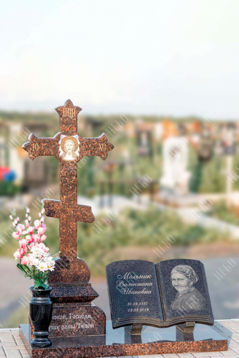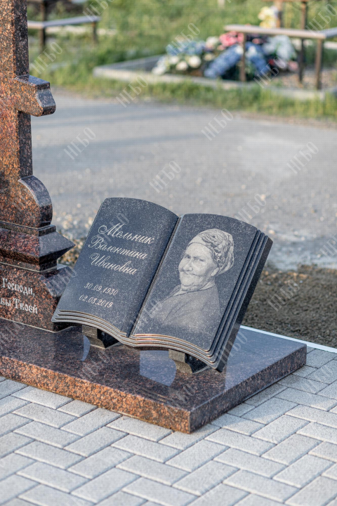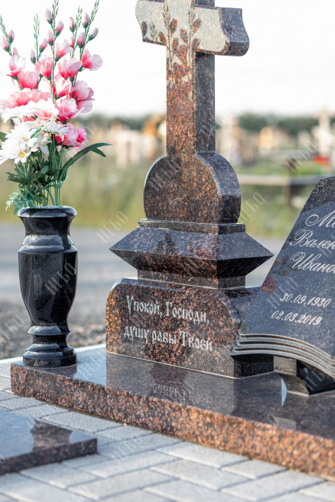 Памятник для православного человека выполнен в виде книги. Ритуальное изделие сочетает в себе закрытое гранитное надгробие, стелу в виде открытой книги и возвышающийся над ней крест. На площадке захоронения так же расположена скамья, изготовленная из того же материала. В гранитной вазе у основания стелы будут гармонично смотреться цветы, дополняя визуальный образ ритуального изделия. Параметры и объемы памятника, тщательно проработанные экспертами на этапе подготовки макетов, гарантируют ему долговечность и исключают деформации.